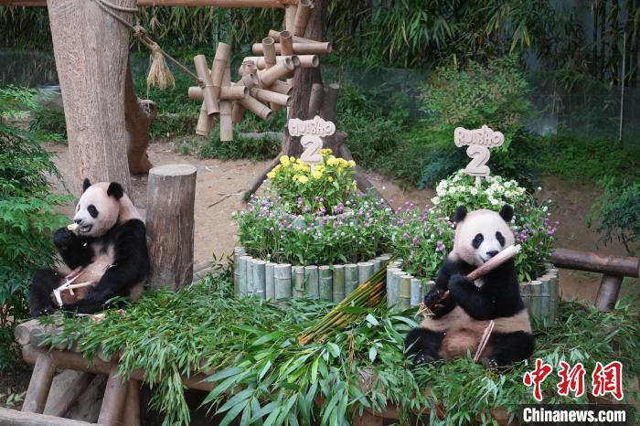 生日會上,園方為大熊貓雙胞胎準備了由竹子、鮮花等制成的生日蛋糕。生日禮物則有能在炎炎夏日中帶來涼爽體驗的冰床,以及各類竹子制成的“豐容”玩具等。