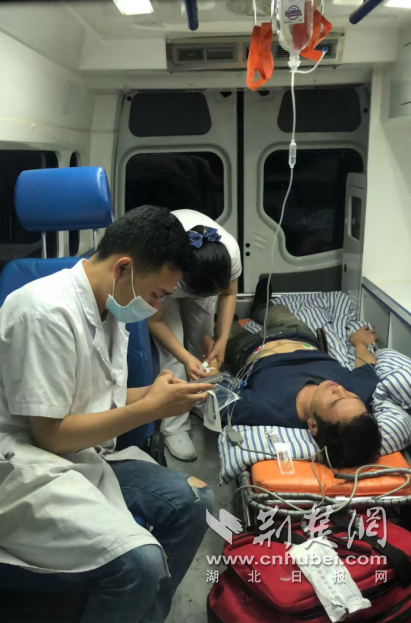 咸豐縣人民醫(yī)院急診科值班護(hù)士賀鑫琦火速通知,醫(yī)生譚偉、護(hù)士陳馳龍與司機楊光北三人頂著傾盆大雨驅(qū)車疾馳。途中水流湍急,車身劇烈搖晃。