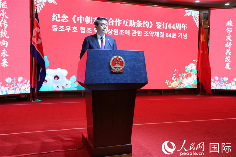 當?shù)貢r間7月9日,中國駐朝鮮大使王亞軍在紀念《中朝友好合作互助條約》簽訂64周年招待會上致辭。 人民網(wǎng)記者 劉融攝