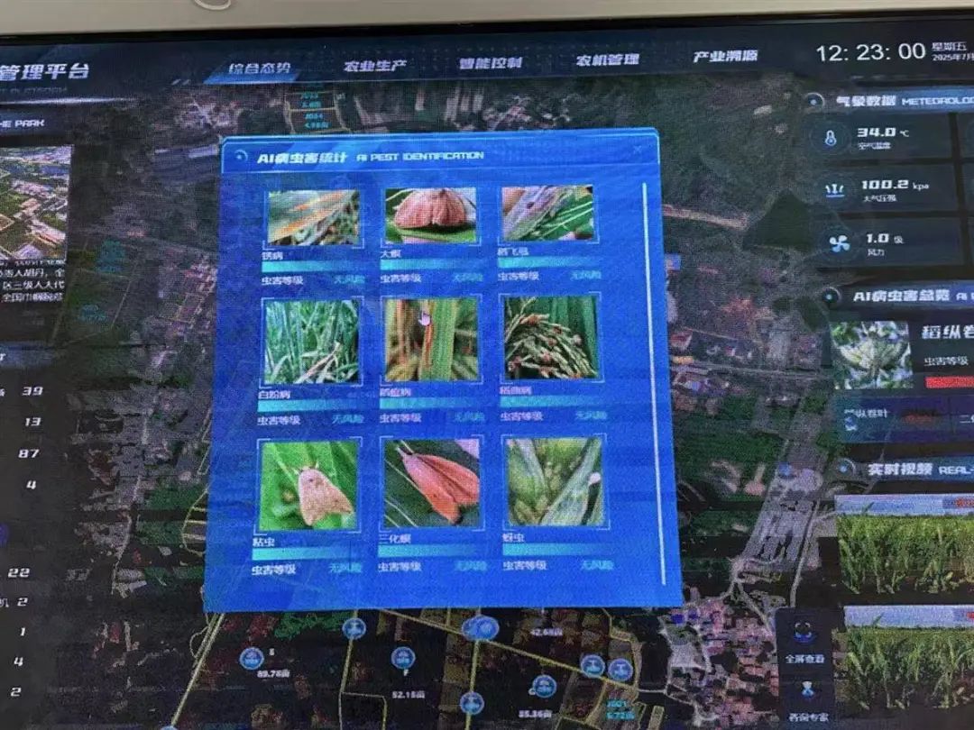 置身田間,每隔10畝地就佇立著一盞太陽能滅蟲燈。農(nóng)場控制室的智慧大屏上,害蟲種類、病蟲害風(fēng)險預(yù)警等信息一覽無余。
