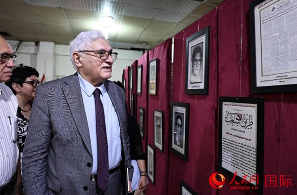 伊拉克共產(chǎn)黨總書記拉伊德·法赫米(右一)在觀看展覽。人民網(wǎng)伊納斯·易卜拉欣攝