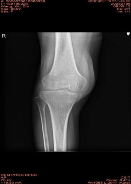 據(jù)了解,王女士飽受右膝關(guān)節(jié)疼痛折磨長達三年,日常行走刺痛難忍,上下樓梯更是困難重重。屋漏偏逢連夜雨,近日一次意外摔倒導(dǎo)致其右膝關(guān)節(jié)腫痛,屈伸活動明顯受限。在家人陪同下,王女士緊急前往潛江市中心醫(yī)院就診。門診X線檢查結(jié)果顯示:“右髕骨骨折,斷端稍有位移”,隨后她被收入骨外科Ⅱ病房,接受進一步的診斷和治療。