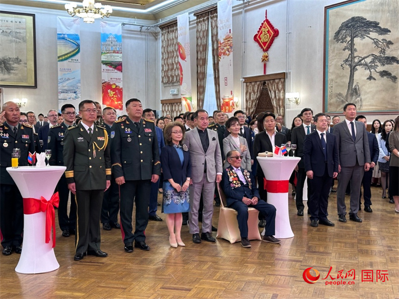 人民網(wǎng)烏蘭巴托7月31日電 (記者張朋輝)7月31日晚,中國(guó)駐蒙古國(guó)大使館舉辦慶祝中國(guó)人民解放軍建軍98周年、紀(jì)念中國(guó)人民抗日戰(zhàn)爭(zhēng)暨世界反法西斯戰(zhàn)爭(zhēng)勝利80周年招待會(huì)。中國(guó)駐蒙古國(guó)大使沈敏娟、國(guó)防武官?gòu)埿懔即笮?,蒙古?guó)國(guó)防部國(guó)務(wù)秘書(shū)岡呼亞格少將、國(guó)家大呼拉爾法律常設(shè)委主席朝格特巴特爾等蒙方官員,參加抗日戰(zhàn)爭(zhēng)老兵及家屬,各界友好人士及部分駐蒙使節(jié)等近300人參加了招待會(huì)。