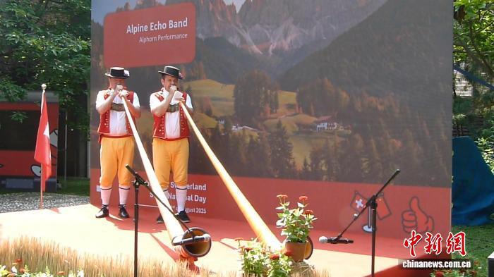 8月1日,演奏家在北京瑞士駐華大使館演奏瑞士傳統(tǒng)管樂器阿爾卑斯號角,慶祝瑞士國慶日?!≮w婧姝 攝