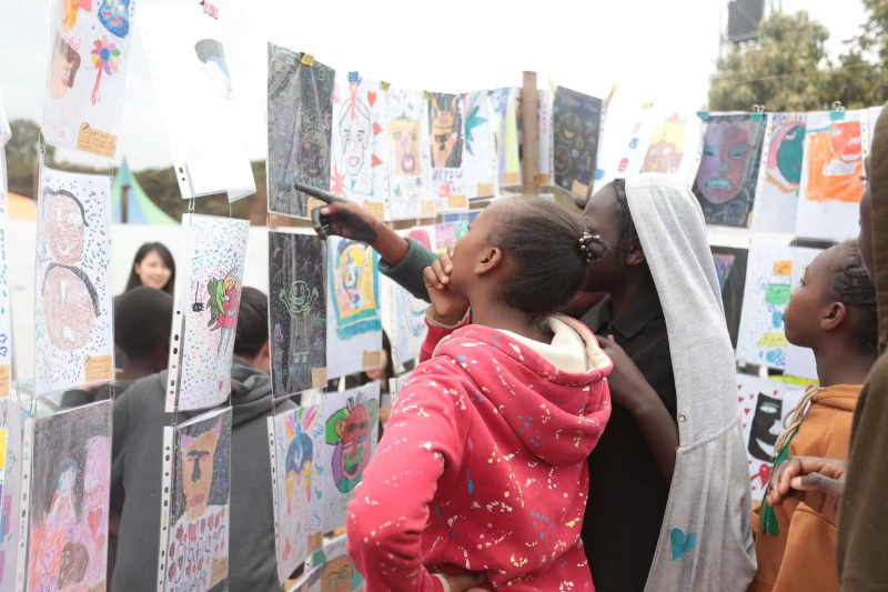 近800名當?shù)貎和ㄟ^面具、編織、雕塑、繪畫等多種形式,共同創(chuàng)作了本次主題藝術(shù)展。這些作品不僅是美的呈現(xiàn),更是社區(qū)堅韌生命力的宣言。其中,一幅幅以火車為主題的繪畫,是孩子們送給中國路橋“非洲之星”公益項目的一份特殊“禮物”,感謝其修建的蒙內(nèi)鐵路為當?shù)貛淼母淖兣c希望。