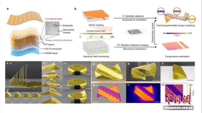在本項研究中,論文共同通訊作者、韓國科學技術院Inkyu Park和Jung Kim與同事合作制作出一個機器人折疊薄片,使用密集分布的熱敏電元件構(gòu)成,受熱可改變形狀。他們用一張40平方厘米的薄片展示了這一方法,該薄片由308個兼具加熱器和感受器功能的電阻構(gòu)成。這種雙功能使之可以實現(xiàn)精確控制移動,系統(tǒng)可根據(jù)感受器反饋作出持續(xù)調(diào)整。