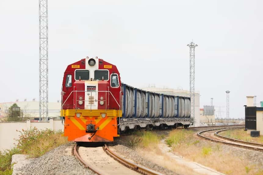 在蒙內(nèi)鐵路內(nèi)羅畢終點(diǎn)站,一列貨物列車行駛在鐵路線上。非洲之星鐵路運(yùn)營有限責(zé)任公司供圖