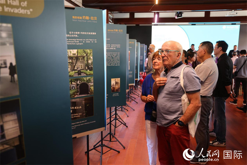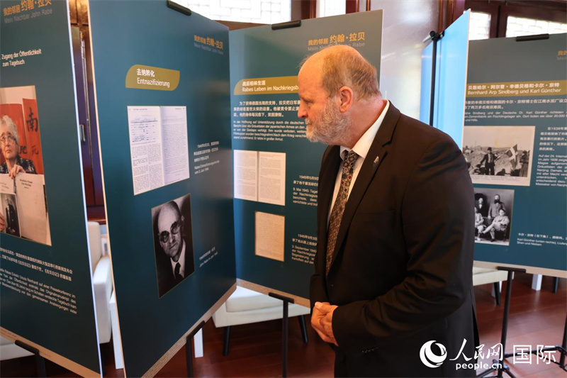 圖為賴因哈特在仔細觀看介紹拉貝生平的展板。人民網(wǎng)記者 劉仲華攝