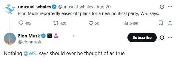 中新網(wǎng)8月21日電 據(jù)美國(guó)《華爾街日?qǐng)?bào)》19日援引知情人士消息報(bào)道稱,美國(guó)企業(yè)家馬斯克正悄然對(duì)他成立新政黨的計(jì)劃踩剎車。對(duì)此,馬斯克20日在社交媒體平臺(tái)X上回應(yīng)稱:“《華爾街日?qǐng)?bào)》所說(shuō)的任何事情都不應(yīng)該被視為是真實(shí)的?!?/p>