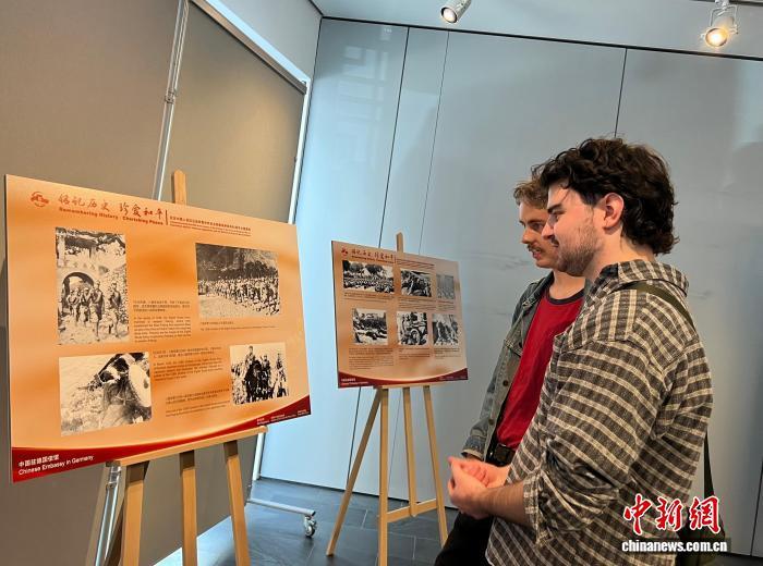 當(dāng)?shù)貢r(shí)間8月26日晚,紀(jì)念中國(guó)人民抗日戰(zhàn)爭(zhēng)暨世界反法西斯戰(zhàn)爭(zhēng)勝利80周年圖片展在柏林中國(guó)文化中心開(kāi)幕。圖為德國(guó)觀眾觀展。中新社記者 馬秀秀 攝