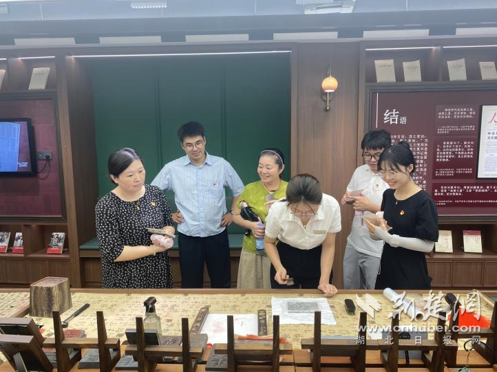 在工作人員的講解中,黨員干部們深入了解了書店背后的故事,并親手參與了館內(nèi)拓印等非遺體驗(yàn)項(xiàng)目。手掌與墨拓相遇的瞬間,大家仿佛穿越回那個(gè)戰(zhàn)火紛飛的年代,更直觀地感受到革命文化工作者的堅(jiān)守與智慧。