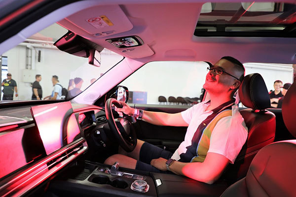 觀眾體驗長城汽車的新能源車(前)。人民網(wǎng)記者 戴楷然攝