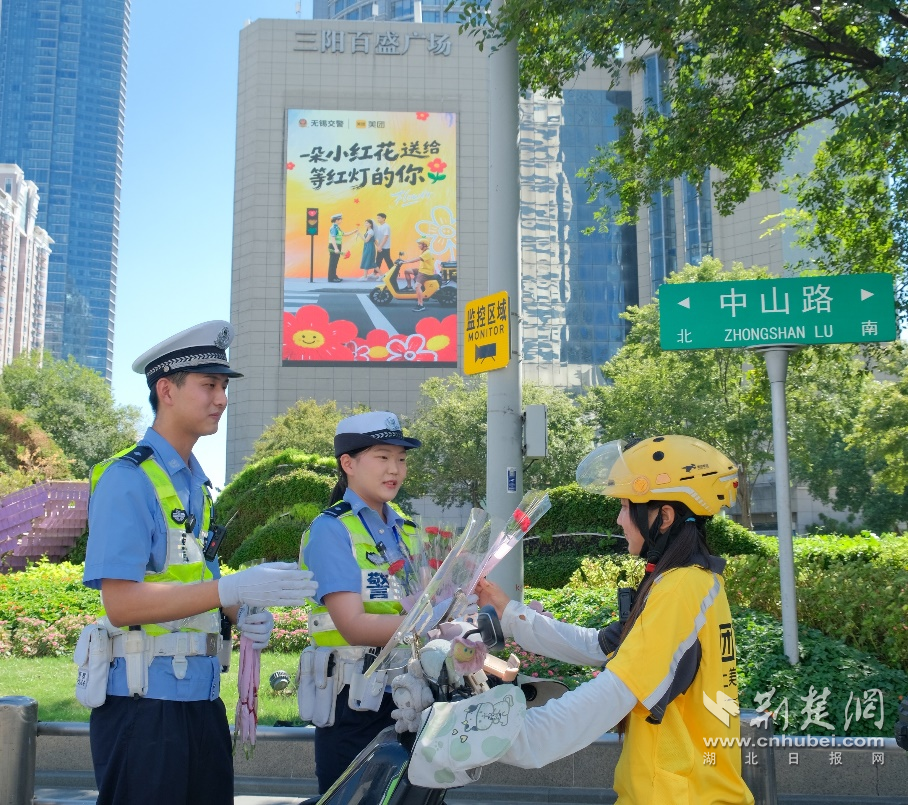 荊楚網(湖北日報網)訊(通訊員小雨)8月29日七夕當天,美團在西寧、鄭州、蘭州、深圳、武漢等全國16座城市同步發(fā)起“送你一朵小紅花”交通安全倡導行動。各城市交警在十字路口、斑馬線前為遵守交通規(guī)則的騎手和市民送上鮮花及反光貼紙,傳遞“安全出行”理念?;顒蝇F(xiàn)場,近萬人領取到倡導交通安全文明的“小紅花”。據了解,這是美團在全國發(fā)起的騎手交通安全正向激勵系列活動之一,旨在推動騎手交通安全意識提升與權益保障的常態(tài)化。
