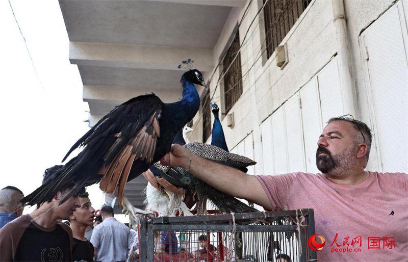 一名商販在逗弄孔雀。人民網(wǎng) 伊納斯·易卜拉欣攝