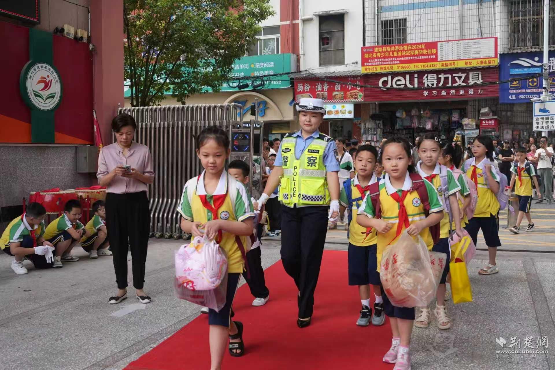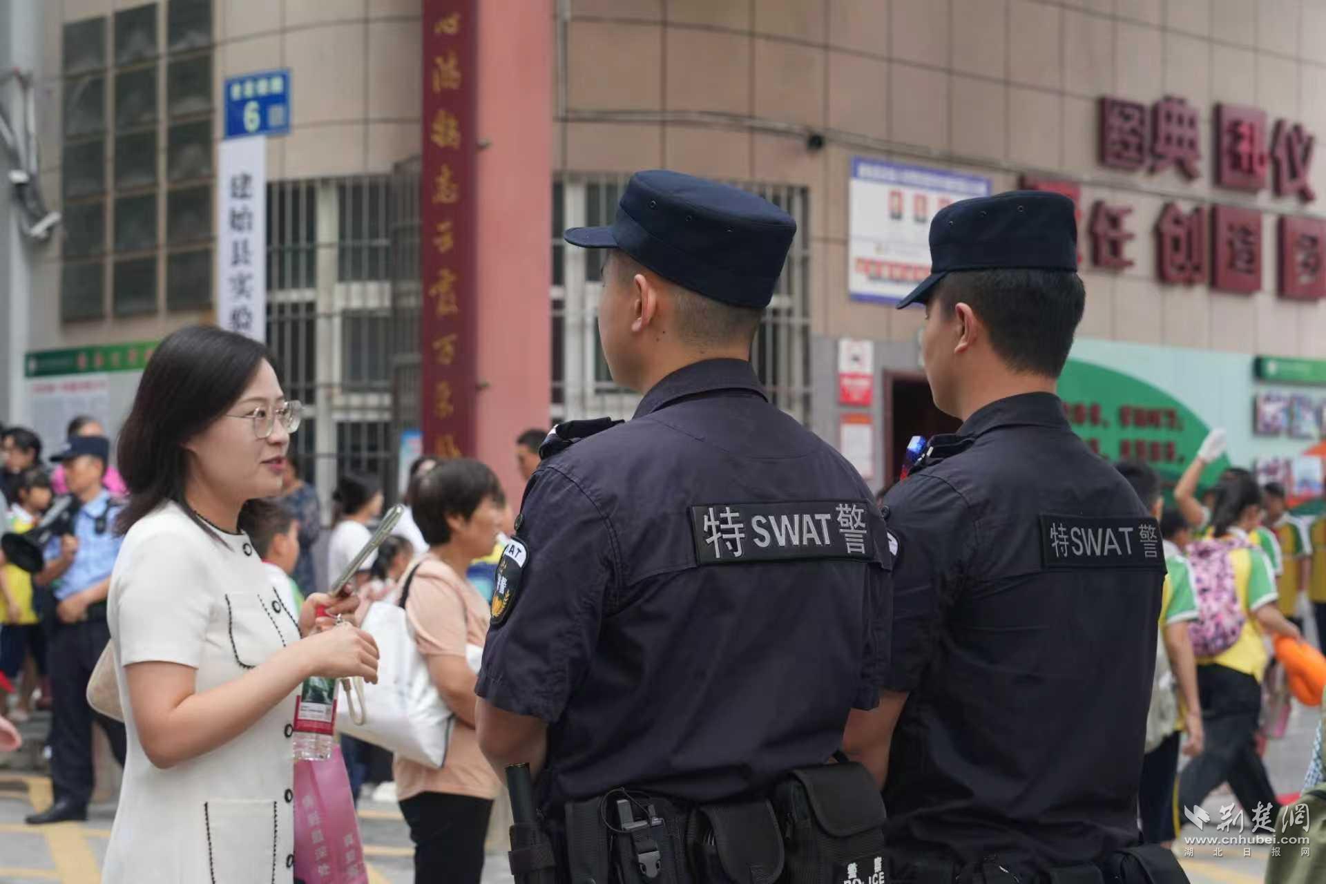 9月1日7時許,在建始縣實驗小學門口,建始縣公安局業(yè)州城區(qū)派出所、交通管理大隊、反恐怖和巡特警大隊民警組成的聯(lián)合執(zhí)勤組早已開始執(zhí)勤,疏導交通、引導家長有序接送學生。當天,全縣公安機關實行“機關捆綁派出所”的護校安園模式,投入警力500余名,設立“護學崗”122余個,嚴格做到校園門口“見警察”、學生途經主要路段“見警車”、校園周邊地區(qū)“見警燈”,全力以赴站好第一班“護學崗”。