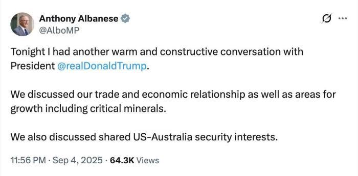 阿爾巴尼斯在社交媒體上發(fā)文稱,他與特朗普又一次進行了“熱情而富有建設性”的對話。雙方討論了經貿關系、關鍵礦產等合作領域以及美澳共同安全利益等問題。