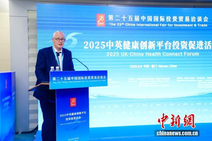 英國駐華大使魏磊(Peter Wilson)9月8日在廈門舉行的2025中英健康創(chuàng)新平臺投資促進活動致辭。第二十五屆中國國際投資貿(mào)易洽談會組委會 供圖