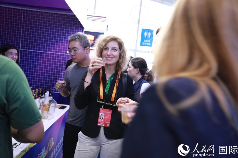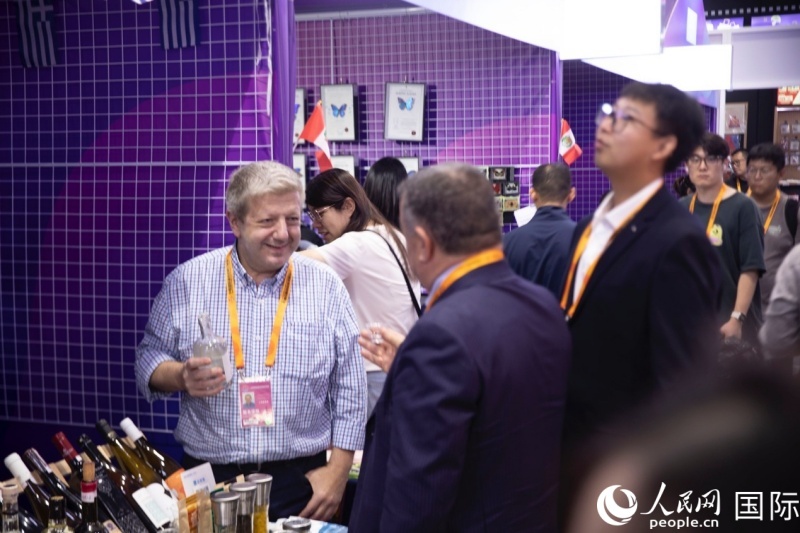 | 希臘共和國駐華大使館展區(qū)工作人員正在向游客介紹特色酒類產(chǎn)品。人民網(wǎng) 李澤攝 |