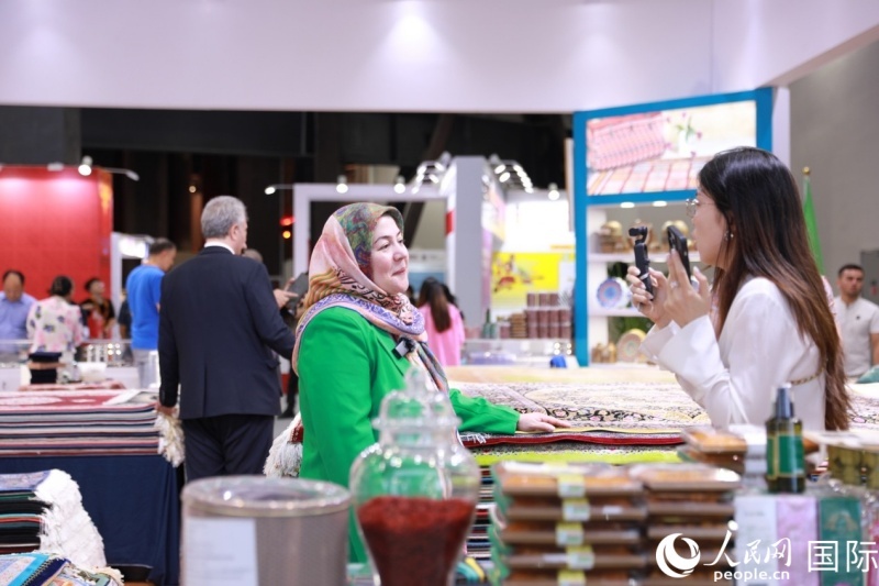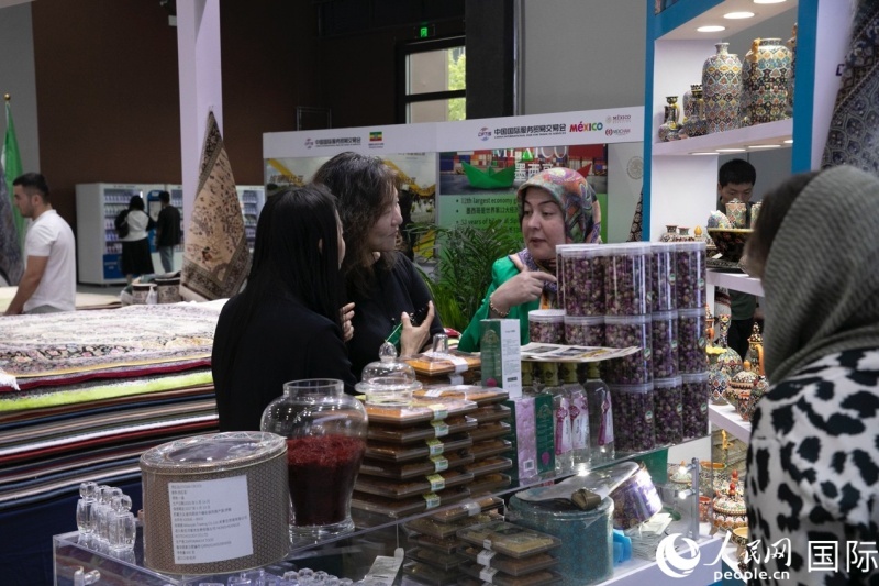 | 伊朗伊斯蘭共和國展區(qū)工作人員正在接受采訪,介紹產(chǎn)品。人民網(wǎng)記者 賈文婷攝 |