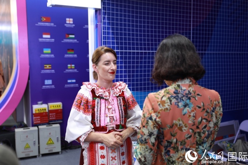 | 斯洛伐克共和國駐華大使館展區(qū)工作人員正在接受記者采訪。人民網(wǎng)記者 賈文婷攝 |