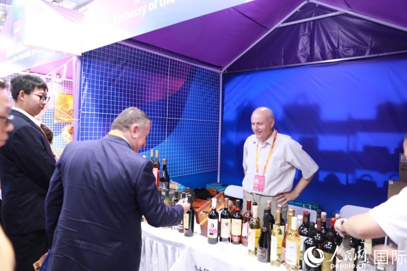 | 游客正在摩爾多瓦共和國駐華大使館展區(qū)了解酒類展品。人民網(wǎng)記者 賈文婷攝 |