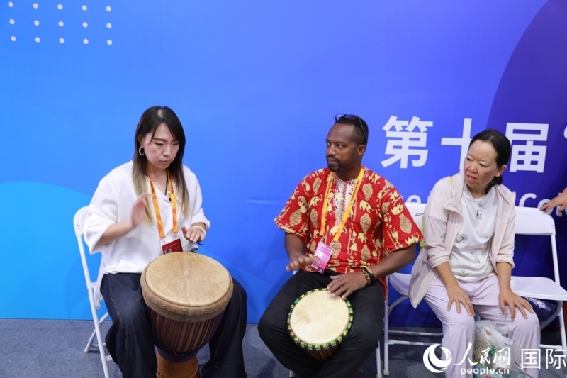 | 馬里共和國駐華大使館展區(qū)工作人員正在教游客表演非洲鼓。人民網(wǎng)記者 賈文婷攝 |
