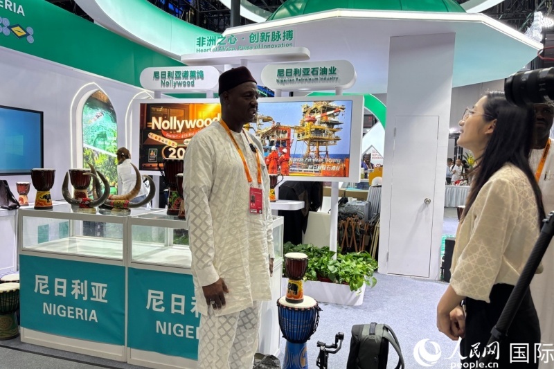 | 尼日利亞聯(lián)邦共和國展區(qū)工作人員正在與記者交談。人民網(wǎng) 高文瀟攝 |