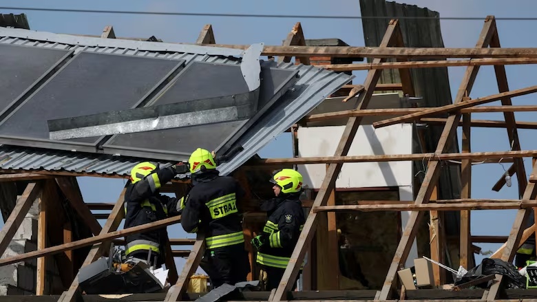 △波蘭盧布林地區(qū),消防員聚集在一座被無(wú)人機(jī)損毀的房屋屋頂上進(jìn)行檢查。
