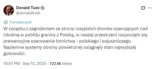 △13日,波蘭總理圖斯克在社交平臺(tái)X上發(fā)帖稱,波蘭及其盟友已在本國(guó)領(lǐng)空展開“預(yù)防性”空中行動(dòng)。