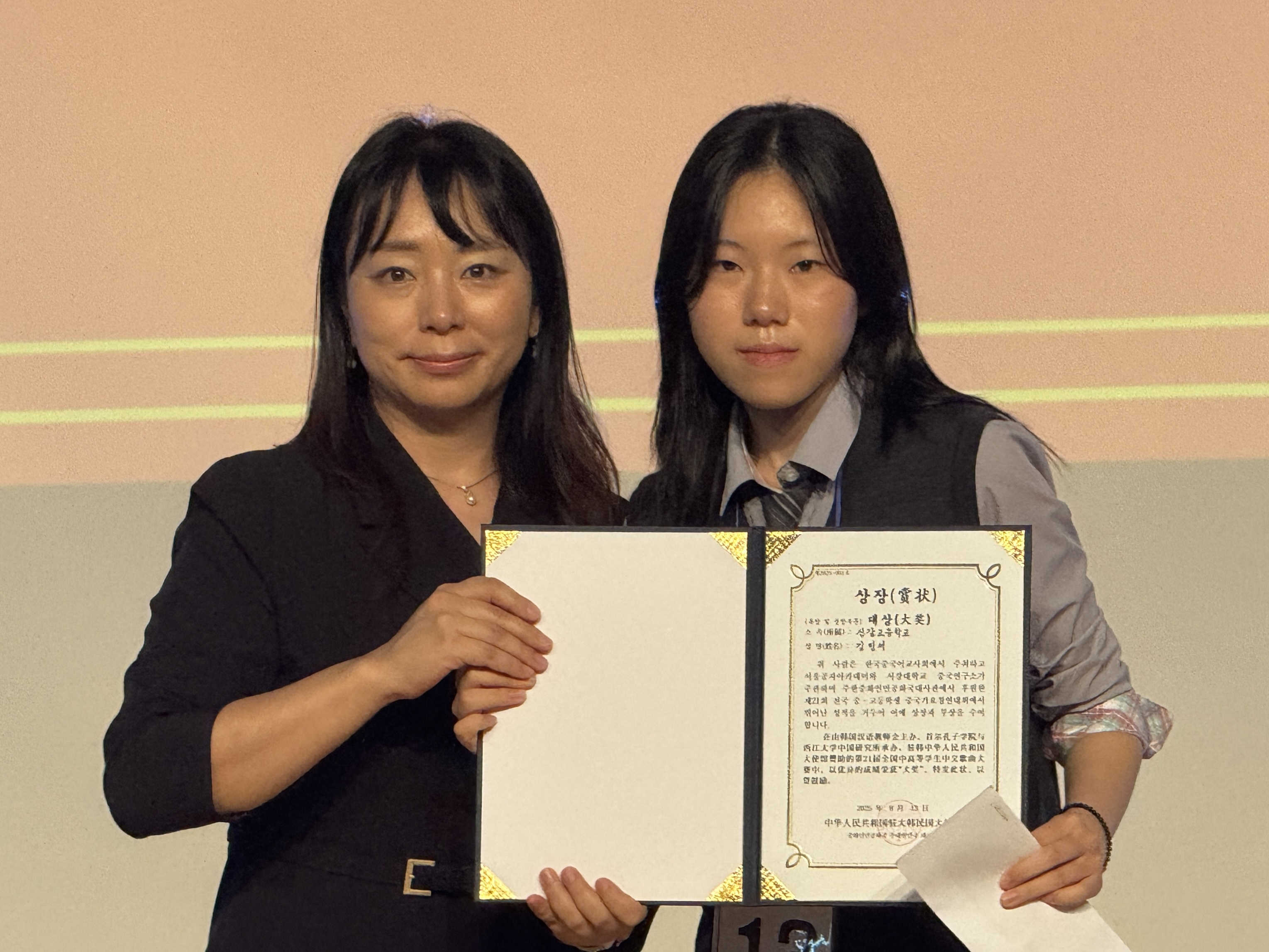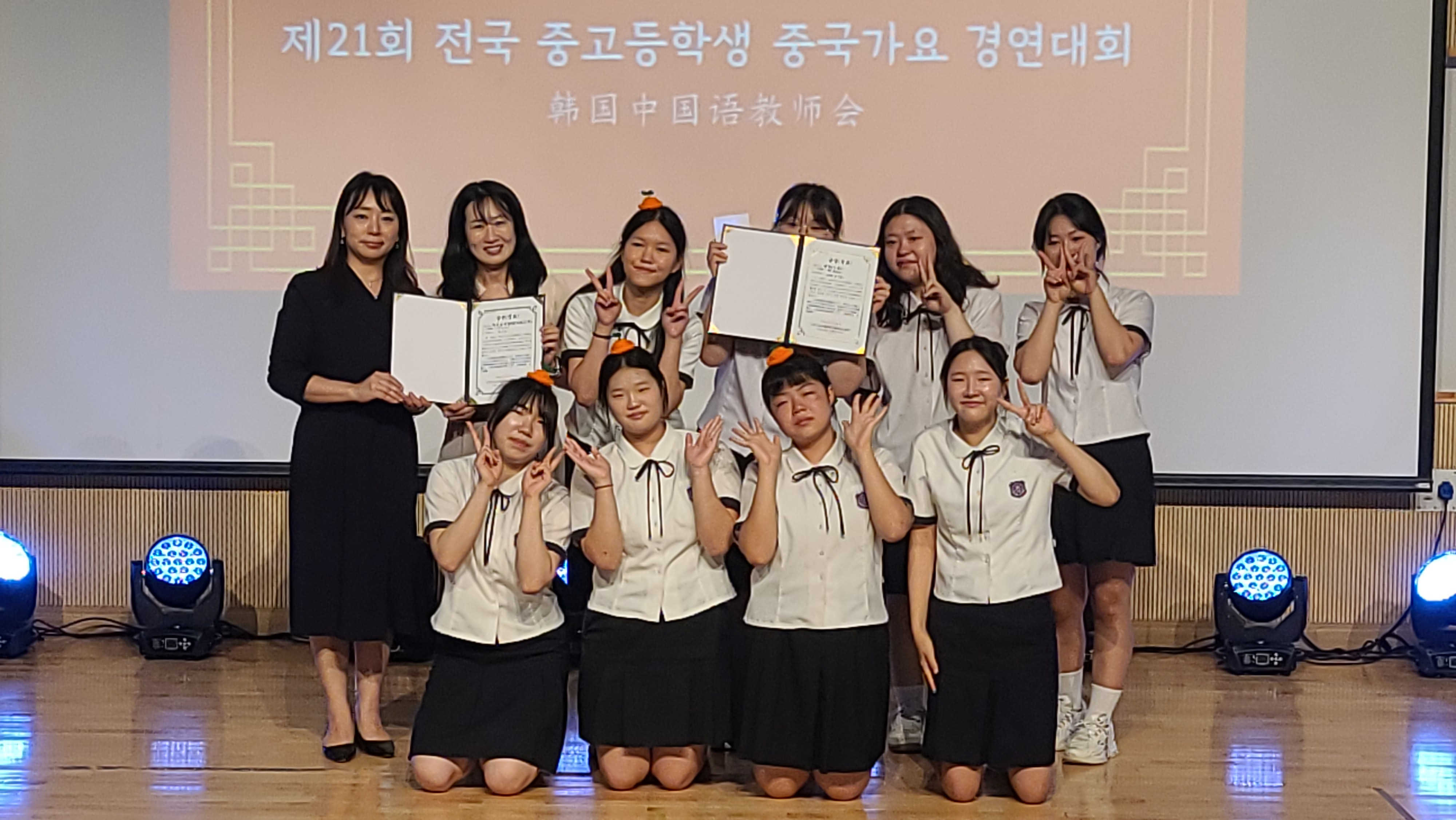 | 13日,“第21屆全國中學(xué)生中文歌曲大賽”在韓國舉行。圖為獲獎(jiǎng)選手與頒獎(jiǎng)嘉賓合影。韓國中國語教師會(huì)供圖 |