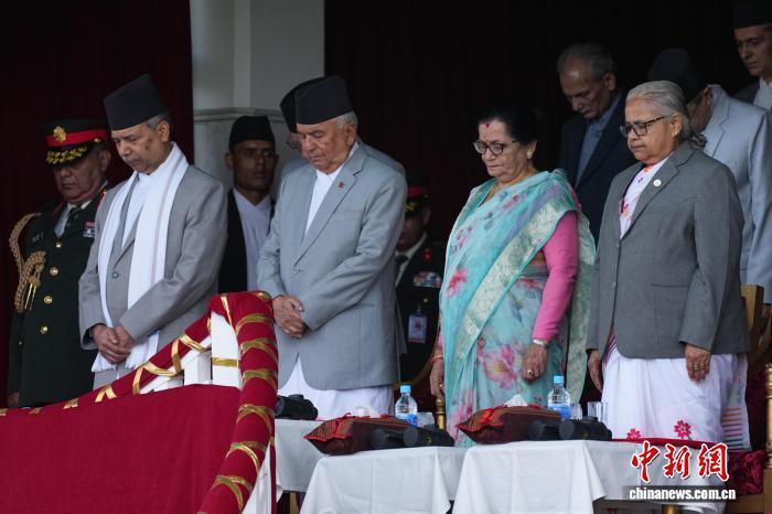 9月19日,尼泊爾臨時(shí)政府舉行憲法日暨國(guó)慶日慶?;顒?dòng),尼泊爾總統(tǒng)鮑德?tīng)?中)、臨時(shí)政府總理卡爾基(右一)等在活動(dòng)開(kāi)始前為近期示威游行死難者默哀。中新社記者 崔楠 攝