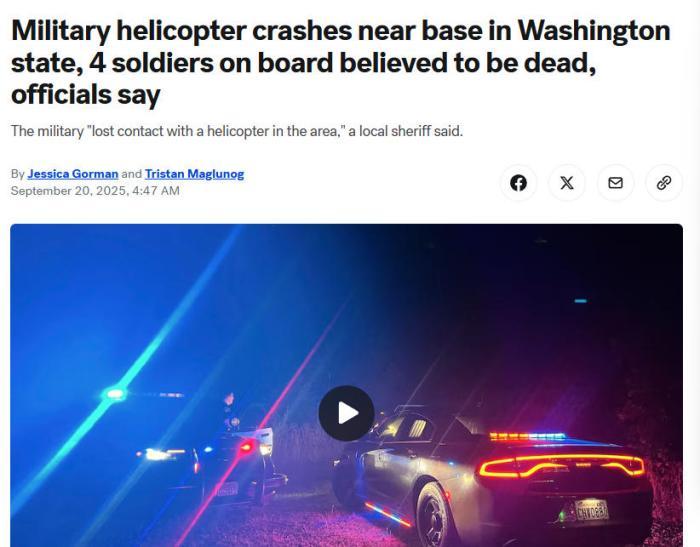 中新網(wǎng)9月20日電 綜合外媒報道,美國陸軍特種作戰(zhàn)司令部當?shù)貢r間9月19日確認,一架MH-60“黑鷹”直升機日前在華盛頓州劉易斯-麥科德聯(lián)合基地附近墜毀,事故或造成4名士兵遇難。