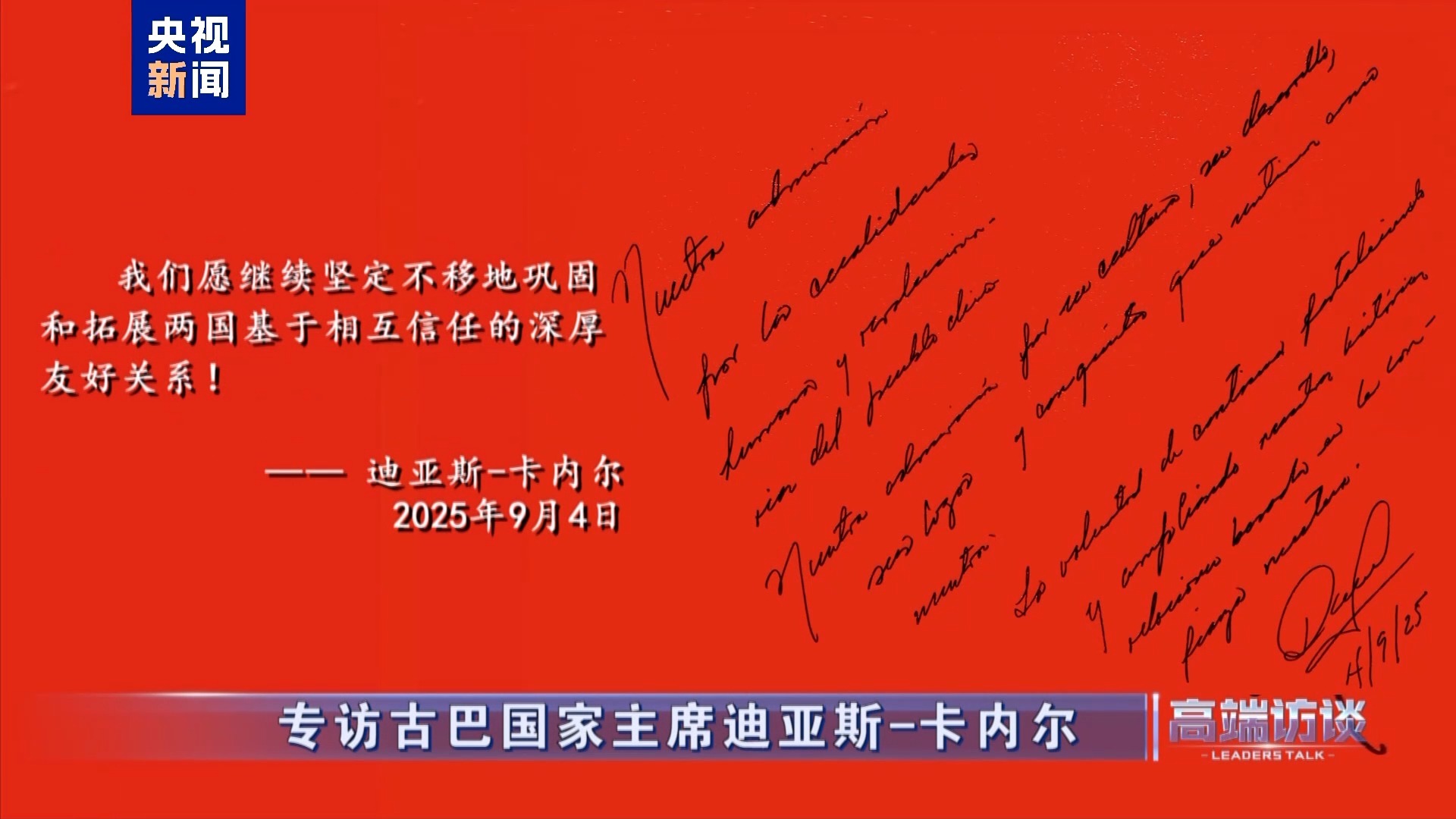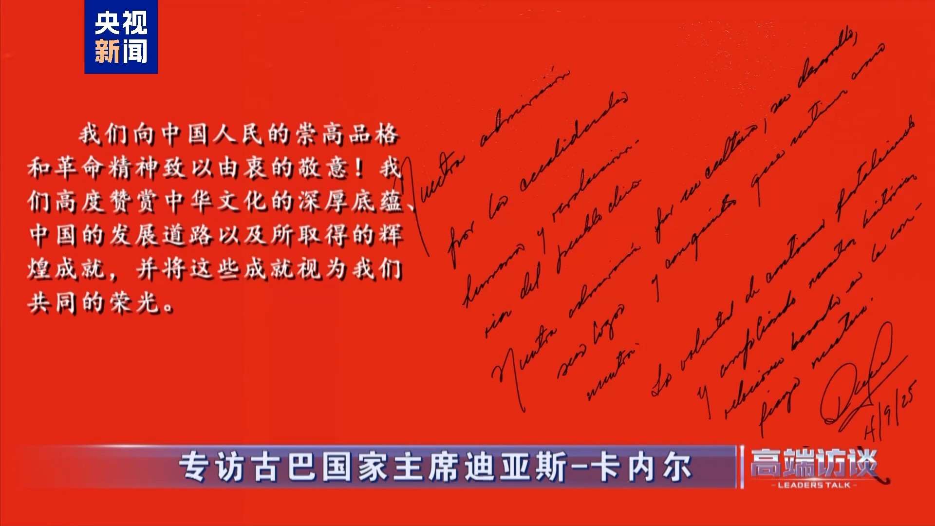 古巴國家主席迪亞斯-卡內(nèi)爾在接受總臺(tái)專訪后題詞:
