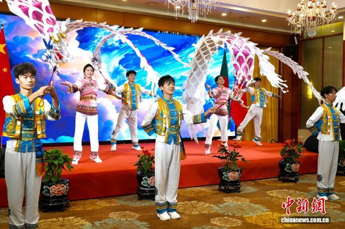 9月26日,慶祝中華人民共和國與孟加拉人民共和國建交50周年招待會(huì)現(xiàn)場(chǎng)演出的白族舞蹈《白族彩帶龍》。 羅婕 攝