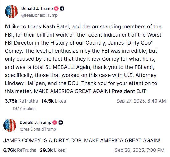 過了短短幾分鐘,特朗普再發(fā)一篇短帖文:“科米是個骯臟警察。讓美國再次偉大!”