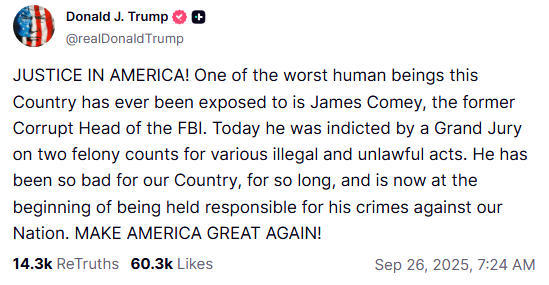 科米被起訴消息公布后,特朗普立即在社交媒體上表示“慶?!?,稱科米“長期以來對美國非常壞”,現(xiàn)在“正義終于得到伸張”。就在數(shù)天前,特朗普還在社交媒體上發(fā)帖,抱怨司法部對科米的調查遲遲沒有下文,要求盡快對科米提起訴訟。