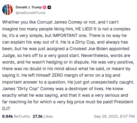 特朗普稱,科米“一直都是骯臟警察”,只不過他剛好碰到了由“騙子喬·拜登”任命的法官,所以開局對他來說倒是挺順利?!叭欢捯殉隹?,他當時既沒有含糊其辭,也沒有提出任何異議。他說得斬釘截鐵,對自己說的話以及表達的意思,心里沒有絲毫不確定。在回答那個重大且關鍵的問題時,他讓自己沒有任何容錯空間。他只是沒料到自己會被抓包。”