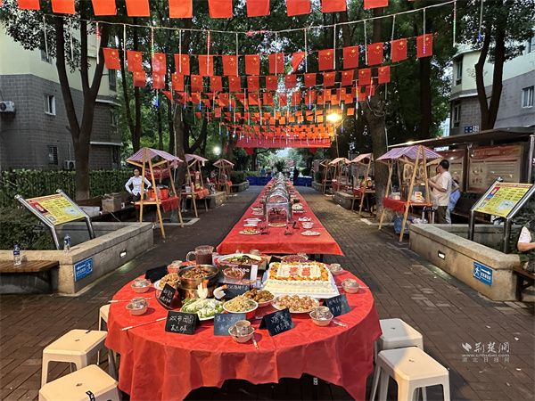 夜幕降臨,團(tuán)圓宴的香味彌漫開來(lái)。此前社區(qū)發(fā)布的“團(tuán)圓宴”菜品招募令得到熱烈響應(yīng),居民們帶著自家拿手菜齊聚一堂,轄區(qū)愛(ài)心企業(yè)和商戶也端來(lái)精心準(zhǔn)備的菜品。紅燒排骨色澤誘人、手工餃子飽含心意、梅菜扣肉香氣撲鼻……百余道家常菜擺滿長(zhǎng)桌,構(gòu)成一幅“百家宴、百家味”的溫馨畫卷。大家端著餐盤穿梭其間,分享美食、交流廚藝,陌生的鄰里因一道菜熟絡(luò)起來(lái),熟悉的街坊借一碗湯增進(jìn)情誼。社區(qū)還聯(lián)合東湖康養(yǎng)養(yǎng)老服務(wù)中心邀請(qǐng)轄區(qū)10位高齡老人代表與祖國(guó)“同慶生”,全場(chǎng)齊唱《生日歌》,共同切分生日蛋糕,甜蜜的滋味伴著歡聲笑語(yǔ),溫暖了在場(chǎng)每一位居民的心。