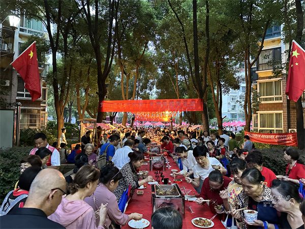 活動(dòng)中,文藝表演與互動(dòng)環(huán)節(jié)穿插進(jìn)行,帥鼓《歌唱祖國(guó)》、民樂(lè)《地道戰(zhàn)》、黃梅戲《再唱山歌給黨聽》輪番上演。當(dāng)54平方米的巨幅國(guó)旗緩緩展開,居民們揮舞小國(guó)旗齊唱贊歌,手中的紙飛機(jī)帶著美好祝愿飛向夜空,電子煙花綻放的瞬間,現(xiàn)場(chǎng)氣氛達(dá)到高潮。此外,三輪抽獎(jiǎng)、“最受歡迎菜品”評(píng)選等環(huán)節(jié),更讓活動(dòng)充滿驚喜與趣味。
