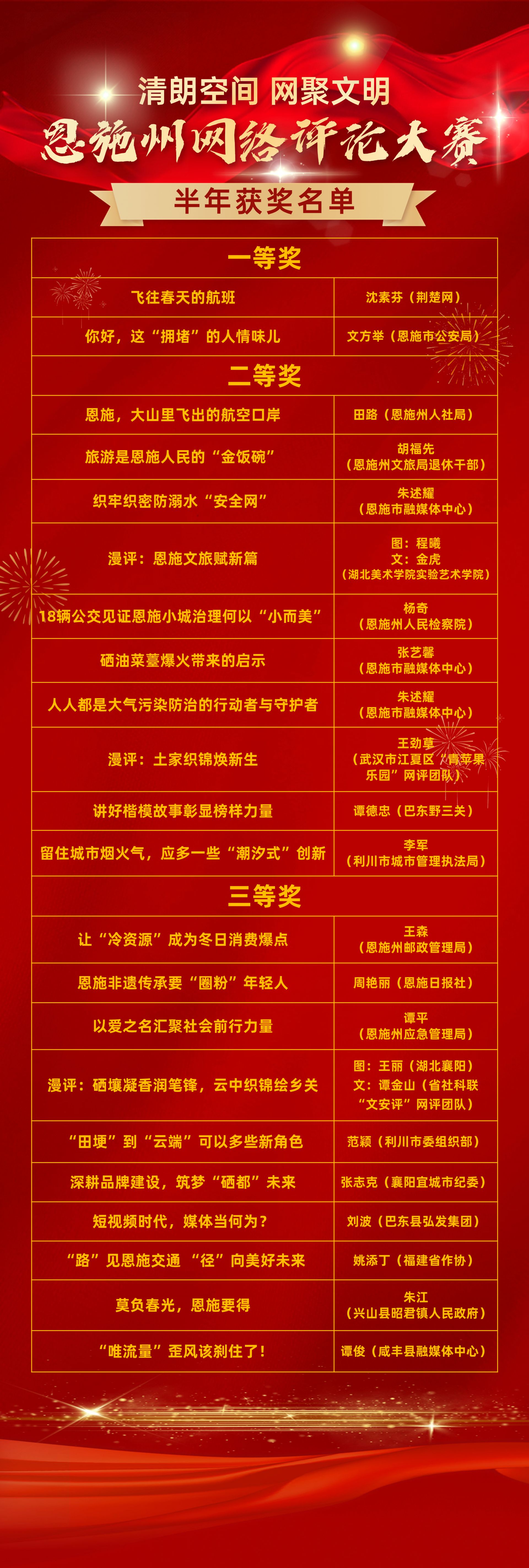 今年1月至6月,大賽組委會共收到全國各地作者投稿385篇,擇優(yōu)在《網(wǎng)信恩施》與荊楚網(wǎng)刊發(fā)62篇。經(jīng)專家組評審,最終評出一等獎2名,二等獎和三等獎各10名。