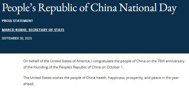 中新網(wǎng)10月1日電 根據(jù)美國國務(wù)院網(wǎng)站當(dāng)?shù)貢r(shí)間9月30日消息,美國國務(wù)卿魯比奧發(fā)表簡短聲明:我謹(jǐn)代表美利堅(jiān)合眾國,就中華人民共和國成立76周年表示祝賀。