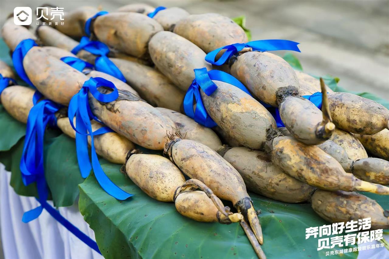 有趣的是,本次比賽為前三名選手準備了迪卡儂山地自行車、王一博同款SKG腰部按摩儀器、Artsmith筋膜槍深層肌肉按摩器外,還向他們特別贈送了1根長約1.6米的蓮藕。這也是當(dāng)天剛從藕塘里挖出的新鮮野藕。這一充滿特色的獎品,寓意著“跑在東湖,暖在胃里”,讓跑友們在享受運動快樂的同時,也能感受到濃濃的江城風(fēng)味。