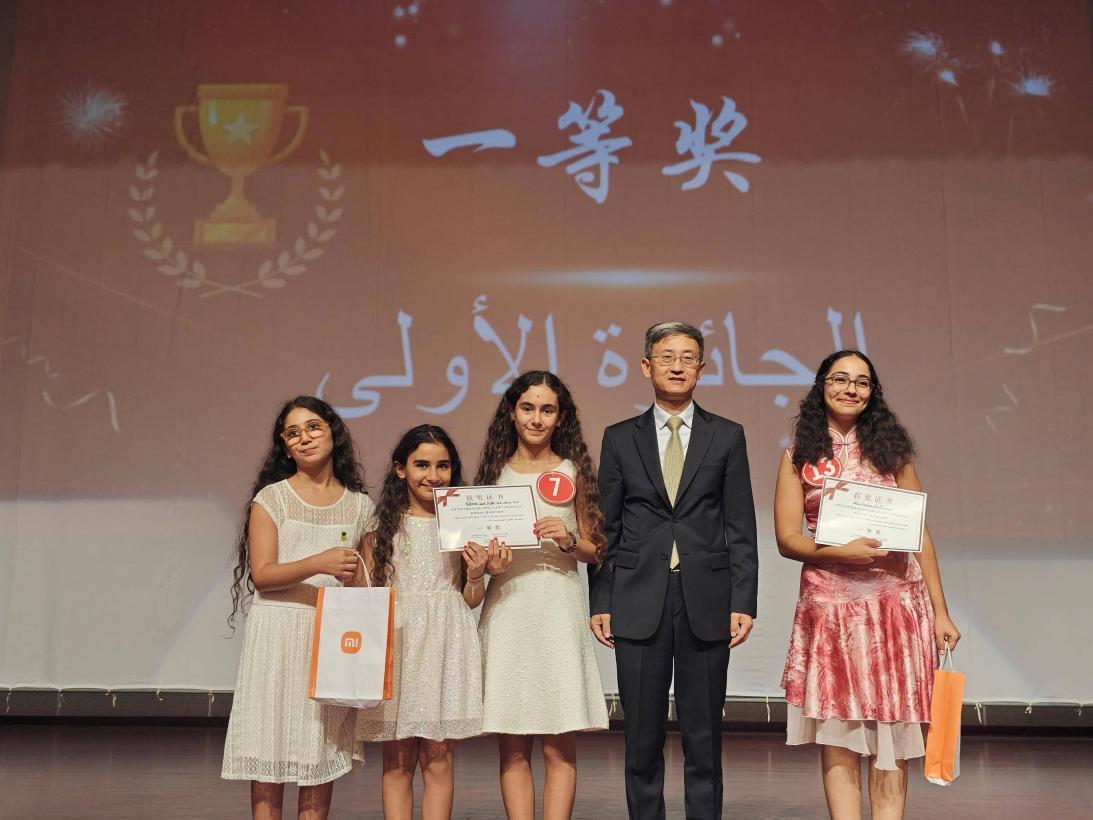 中國駐突尼斯大使萬黎為一等獎(jiǎng)獲得者頒獎(jiǎng)。迦太基大學(xué)孔院供圖