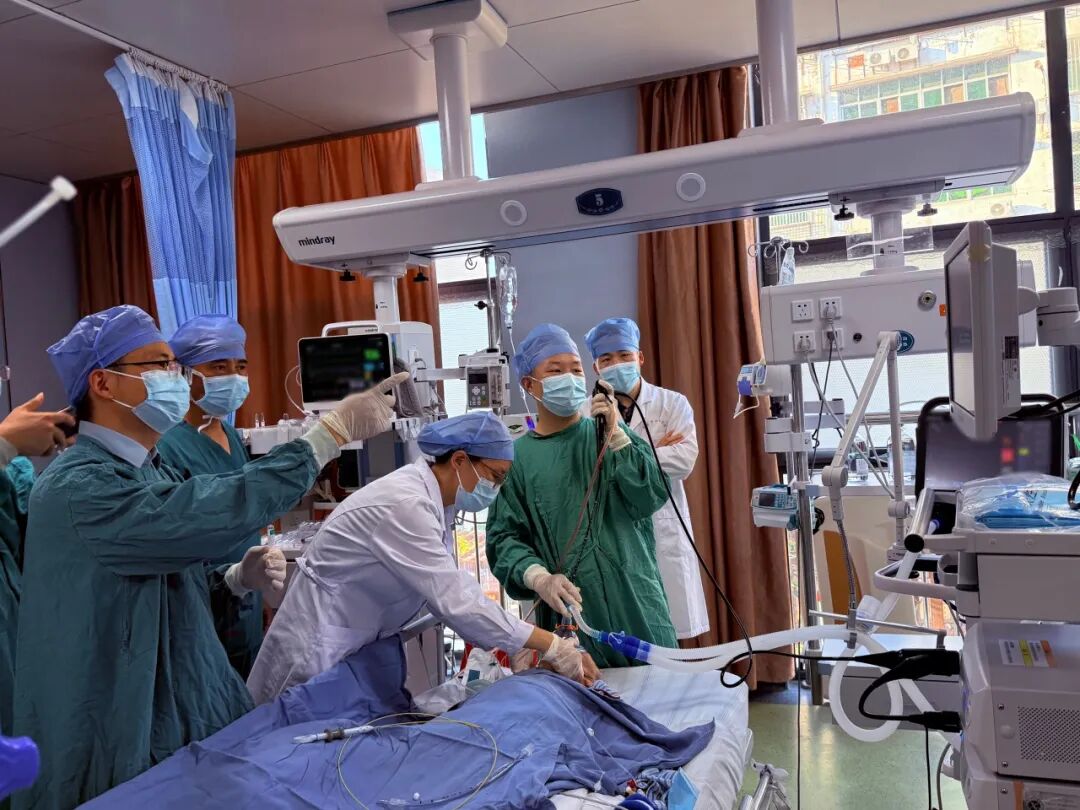 面對如此高危且復雜的病例,急診ICU立即啟動耳鼻咽喉科、甲狀腺乳腺外科、呼吸與危重癥醫(yī)學科等多學科會診(MDT),經(jīng)過多輪討論與風險評估,最后決定由呼吸與危重癥醫(yī)學科厲銀平主任團隊牽頭,聯(lián)合呼吸重癥胡小飛主任團隊、疼痛科付學明主任團隊行“氣管插管內(nèi)經(jīng)支氣管鏡活檢孔道氣管支架置入術(shù)”,并與家屬充分溝通治療方案后獲得同意。