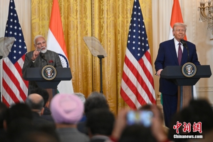 當(dāng)?shù)貢r間2月13日,華盛頓,美國總統(tǒng)特朗普與來訪的印度總理莫迪在白宮舉行會晤。圖為雙方在會晤后出席聯(lián)合記者會。中新社記者 陳孟統(tǒng) 攝