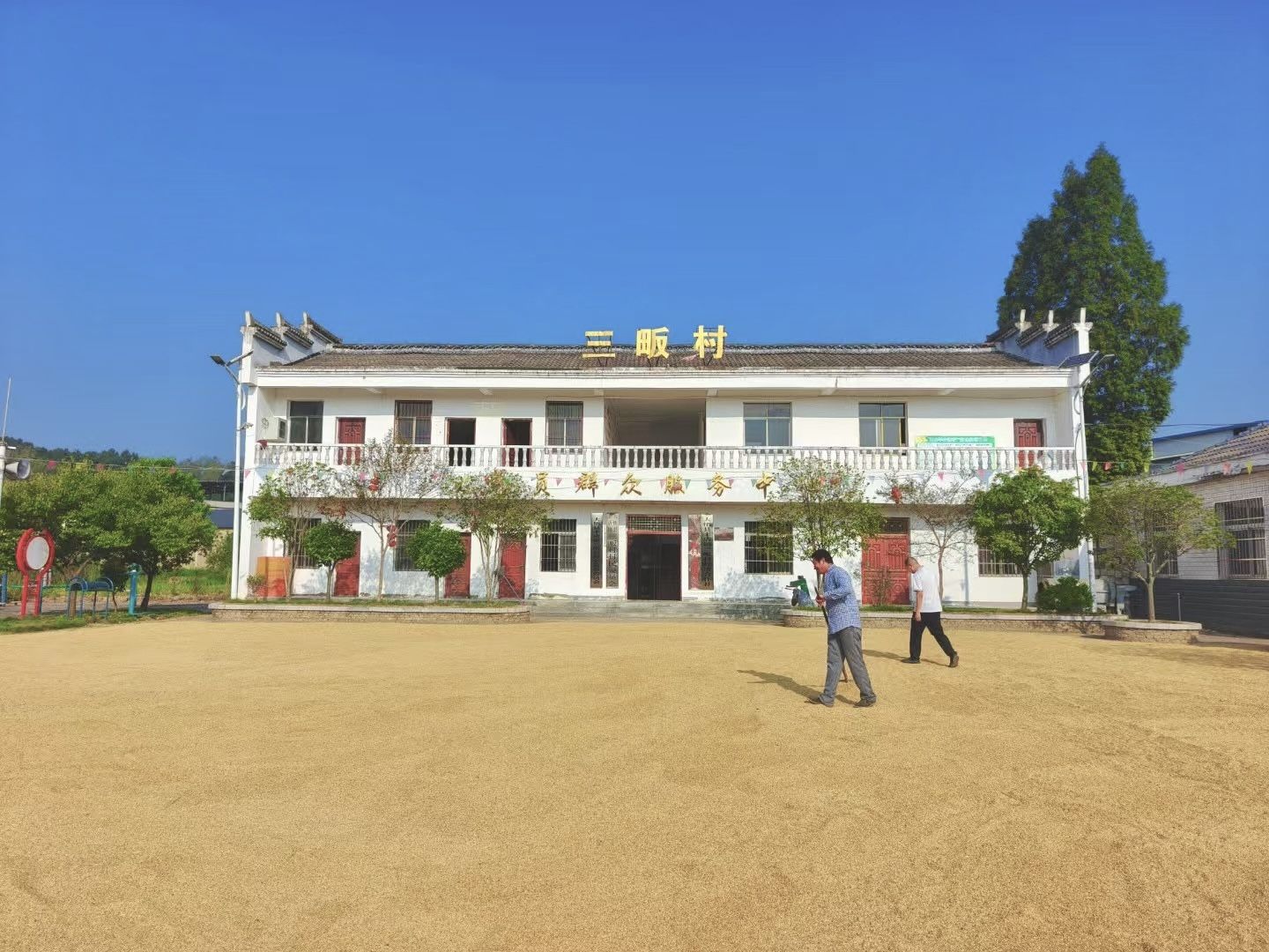 連日來,該鎮(zhèn)各大村委會門前廣場,總是一派繁忙喜悅景象:金燦燦的稻谷鋪就“黃金毯”,村“兩委”黨員干部穿梭其間,彎腰翻曬、快手裝袋,幫村民搶收糧食——這片平日的村民活動場,如今成了全鎮(zhèn)16村“公共曬場”的生動縮影。