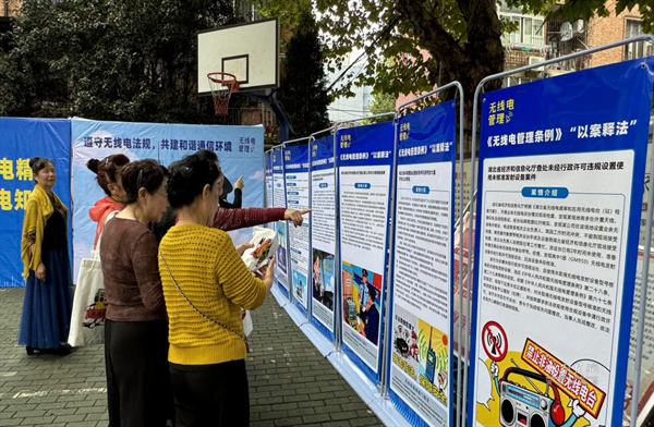 在社區(qū)幸福廣場(chǎng),一排排科普展板前圍滿居民。展板從無(wú)線電基本原理講起,通過(guò)“以案釋法”的形式揭露“黑廣播”“偽基站”的詐騙手法,詳細(xì)說(shuō)明危害與識(shí)別技巧,引導(dǎo)居民合法使用頻譜資源。