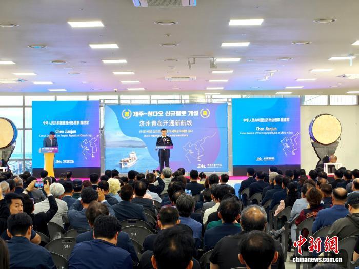 10月18日,“濟(jì)州—青島新航線開通”慶?;顒釉陧n國濟(jì)州舉行。圖為雙方代表參加船舶入港儀式。中國駐濟(jì)州總領(lǐng)事館 供圖