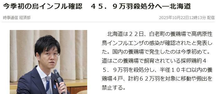 據(jù)報(bào)道,北海道政府決定對(duì)該養(yǎng)雞場(chǎng)飼養(yǎng)的約45.9萬(wàn)只蛋雞實(shí)施撲殺,并禁止半徑10公里內(nèi)的4家養(yǎng)雞場(chǎng)(總計(jì)約62萬(wàn)只)移動(dòng)或外運(yùn)畜禽。