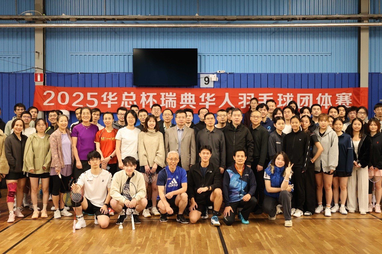 中國(guó)駐瑞典大使館臨時(shí)代辦萬(wàn)德剛出席“華總杯”瑞典華人羽毛球團(tuán)體賽開(kāi)幕式。中國(guó)駐瑞典大使館供圖
